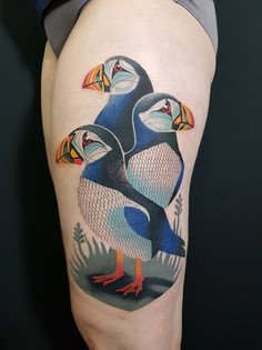 Les tatouages enchanteurs et fous de cette artiste espagnole sont difficiles à décrire - le primitivisme, une variété de techniques artistiques, des motifs médiévaux s'entremêlent dans le tourbillon coloré de l'imagination de l'auteur et donnent naissance à des images inoubliables des personnages de ses tatouages. Son portfolio regorge de couleurs et de formes, mais les œuvres noires ne sont pas moins impressionnantes - c'est une caractéristique de son style d'auteur inimitable.
