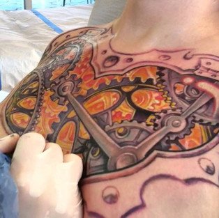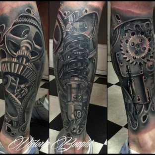 Ces tatouages requièrent une très grande technique puisqu’il doit y avoir des effets d’ombres, de relief et de profondeur pour qu’ils paraissent réels et véritablement posés sous la peau. On doit avoir l’impression qu’il y a vraiment ce genre d’engrenage dans le corps ou de fusions biologiques. Cela peut aussi être des déchirures à certains endroits. Parfois la qualité des ombres et des reliefs peut donner l’impression que l’œuvre sort littéralement de la peau.